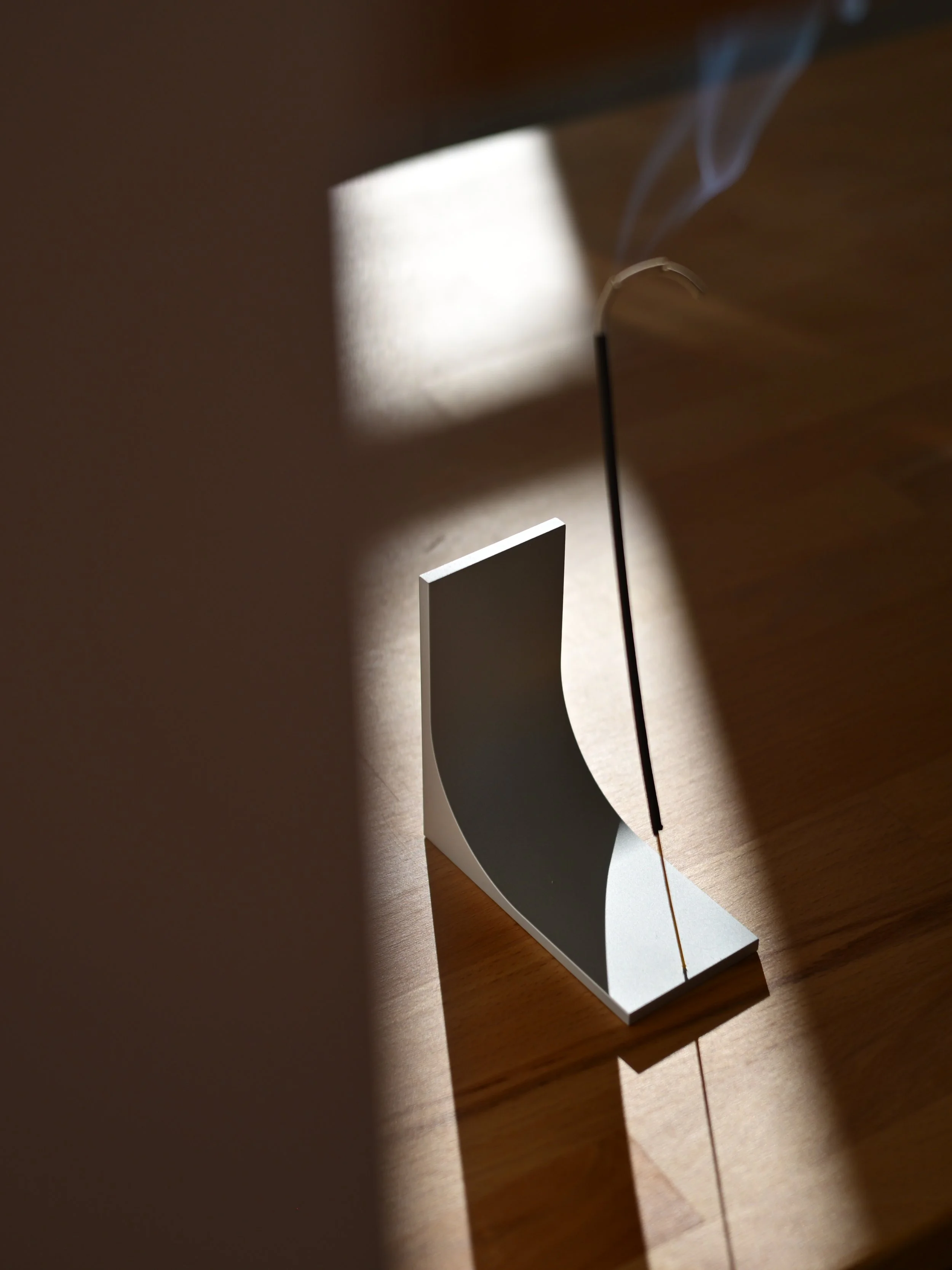Airtime is a monobloc incense burner with a smooth transition designed to collect and slow down falling ashes. With its minimal footprint and distinctive lines, it can also be displayed as a standalone decorative object.
