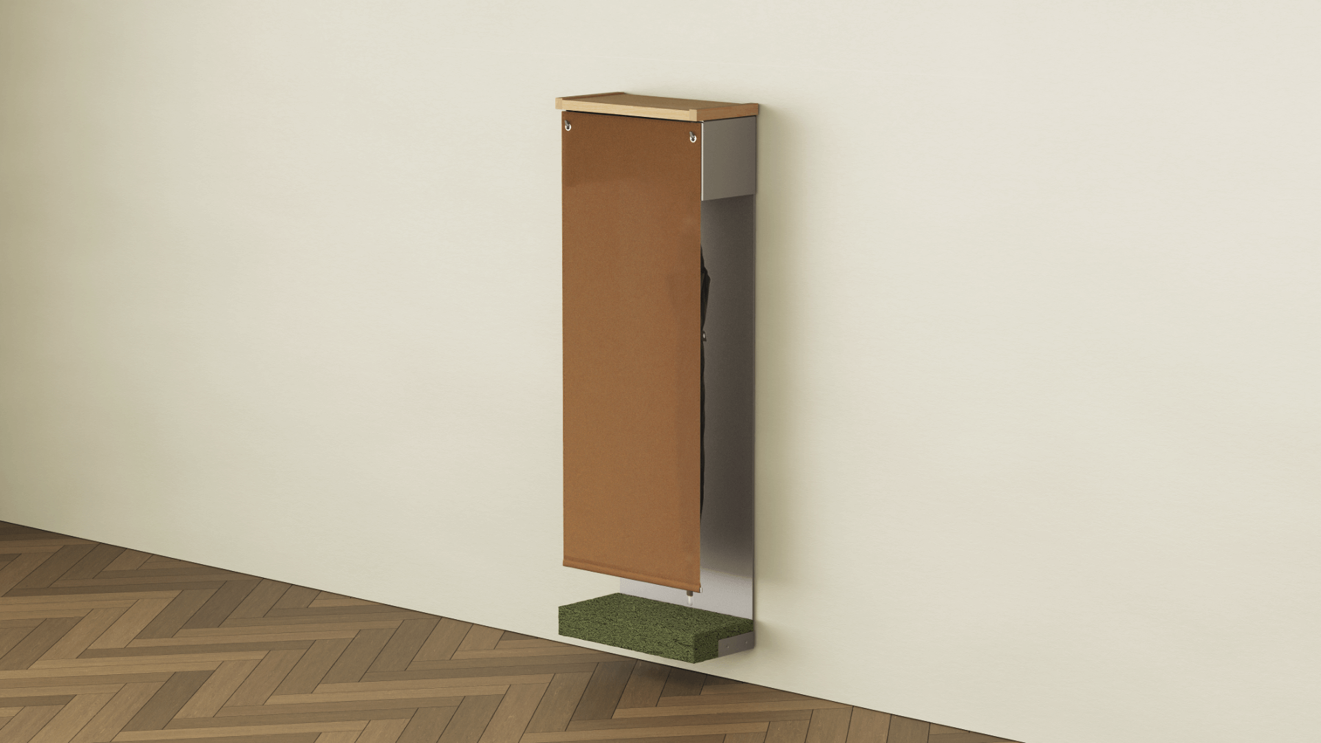 Alcove reimagines the umbrella stand as a multifunctional entryway solution. Designed to handle both wet and dry umbrellas, it features a hempcrete base that naturally absorbs and evaporates moisture. A lightweight linen curtain conceals stored umbrellas, reducing visual clutter, while the wooden shelf provides a convenient perch for everyday essentials. Alcove integrates seamlessly into the home, transforming an infrequently used object into a timeless, space-efficient asset for the entryway.